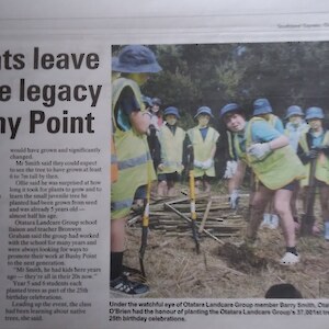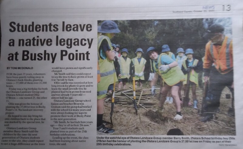 The Bushy Point Planting went very well, thanks to all the Nursery volunteers who helped put out plants onto site and helped with planting – the story and photographs are at this link - https://www.otataralandcare.org.nz/news-events/bushy-point-25th-anniversary-celebration/. Bronwyn also led an Otatara school group planting at Bushy Point on the Friday, planting 5 year old kahikatea and pokaka trees from the Community Nursery, into gaps in the original 2011 plantings, so it was a very successful event all round - see Express article below.