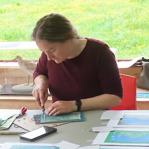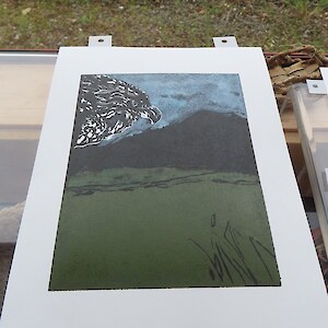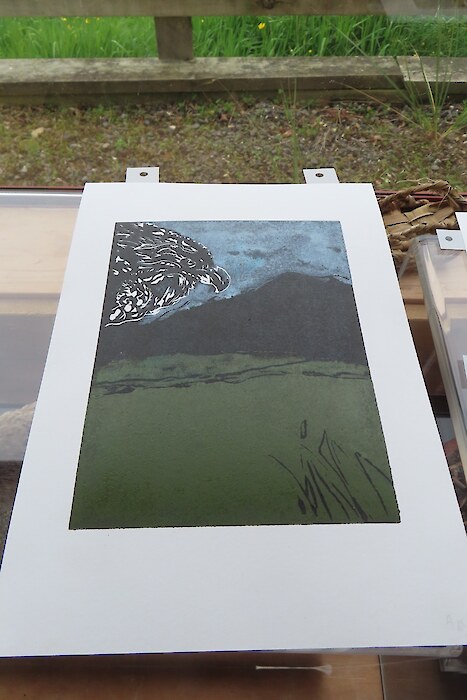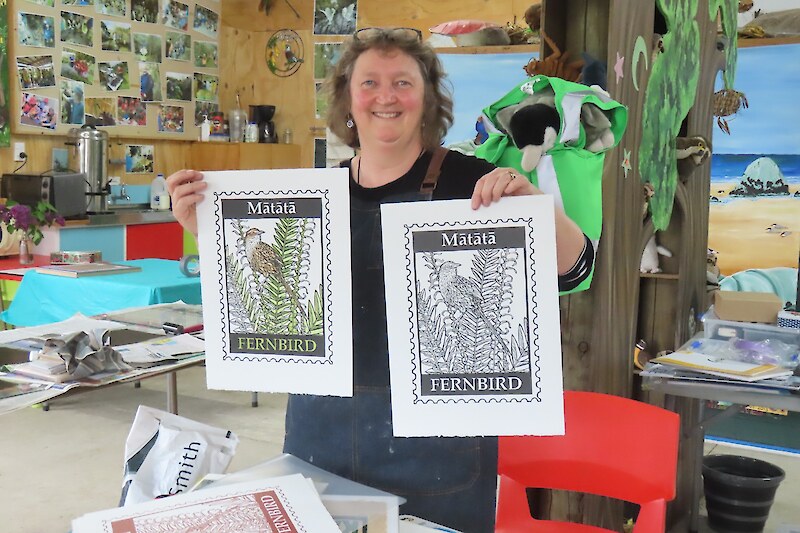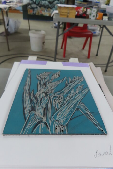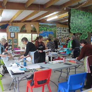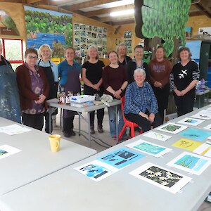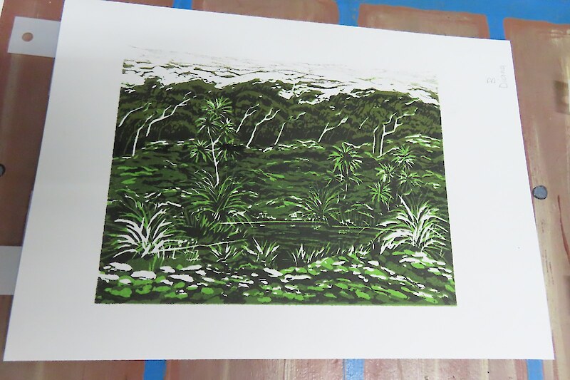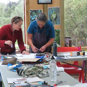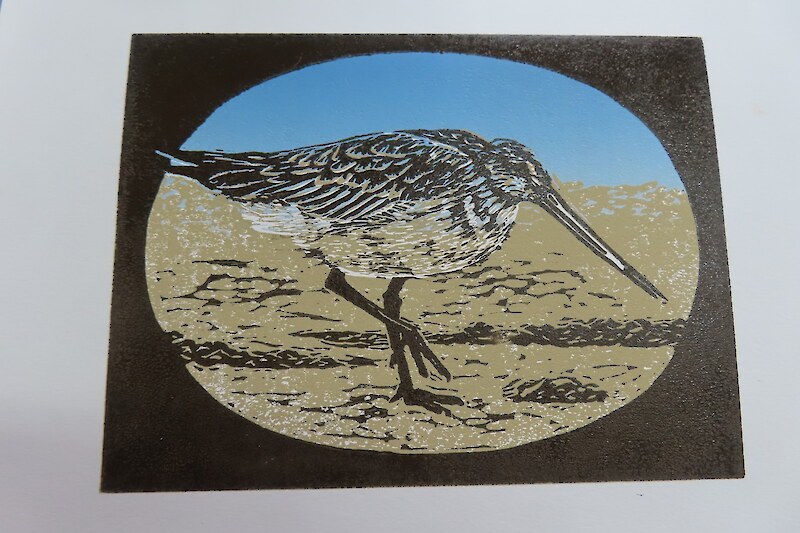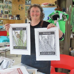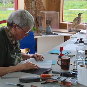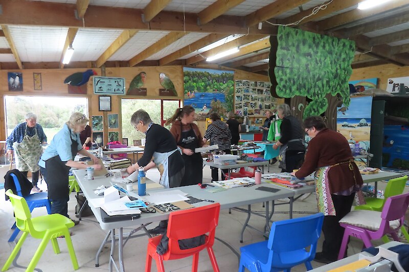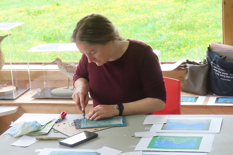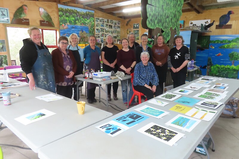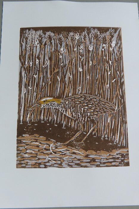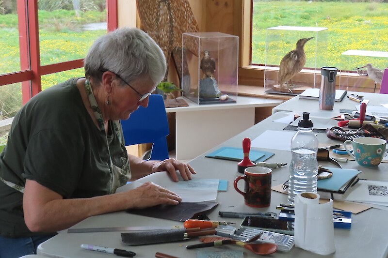 Always eagerly awaited, the workshop’s participants came into the room armed with pencils, paints, paper and enthusiasm. Chris gave a quick introduction to the “place” and a bit of Community Nursery background to newcomers and then Jo was straight into it. The room had been set up the day before with everything needed for “Lino Printing” including the small Nursery Press and a new Press Jo had brought down as well as various cutting tools, paper, paints and other materials. We were also lucky to have some taxidermy native birds from DOC to study very close up. The Rances wetland provided inspiration to some who used the landscape views and plants as themes.