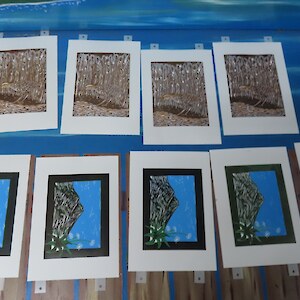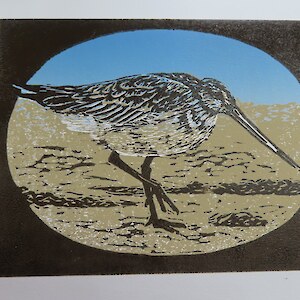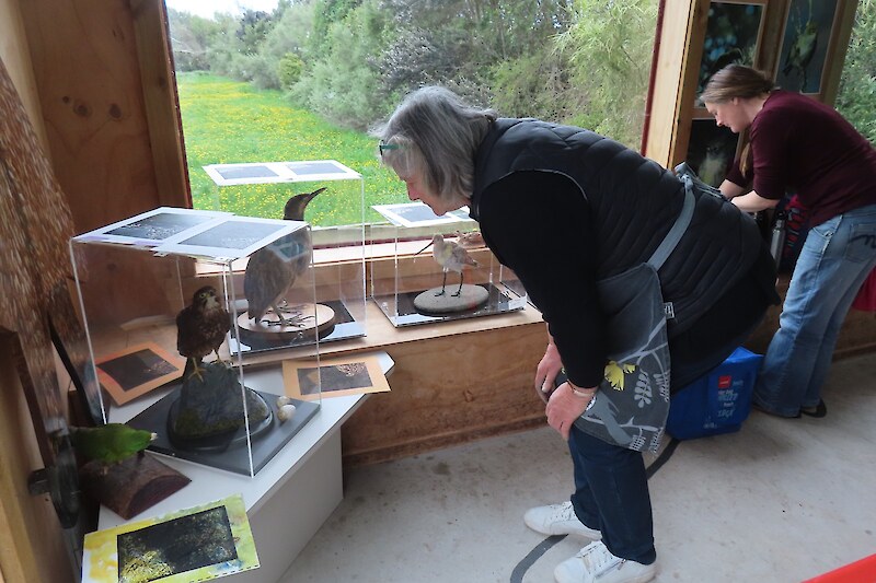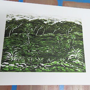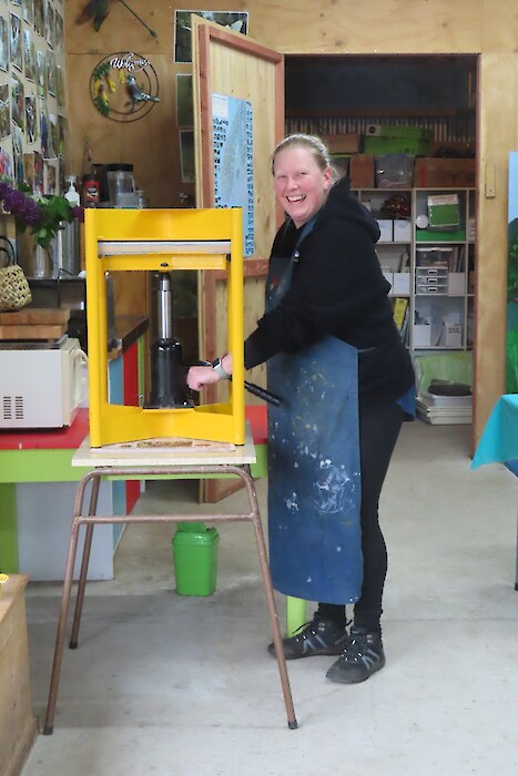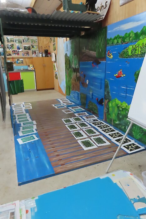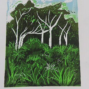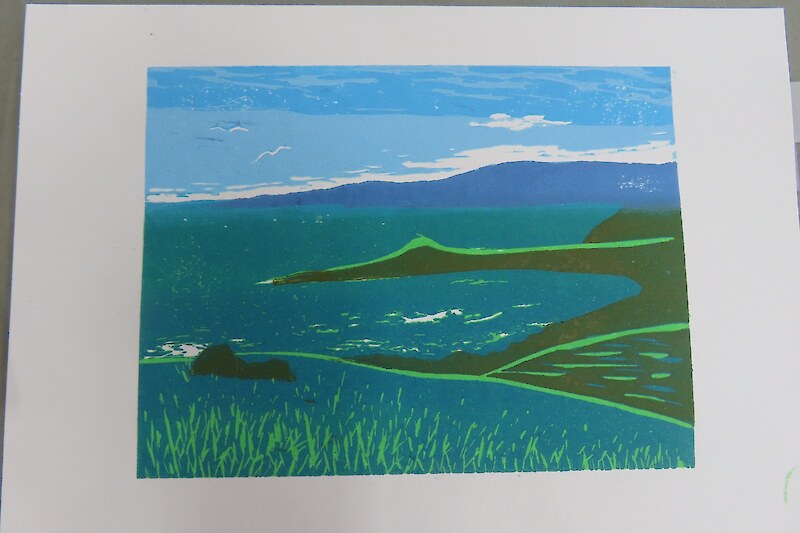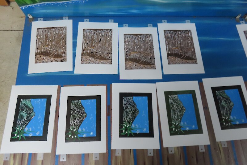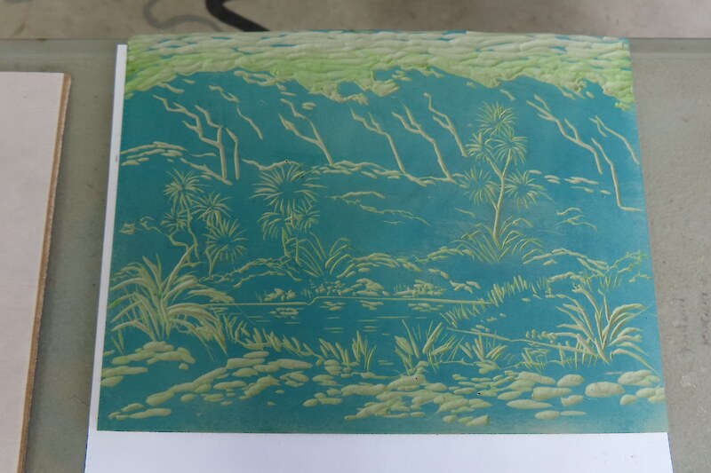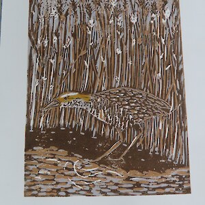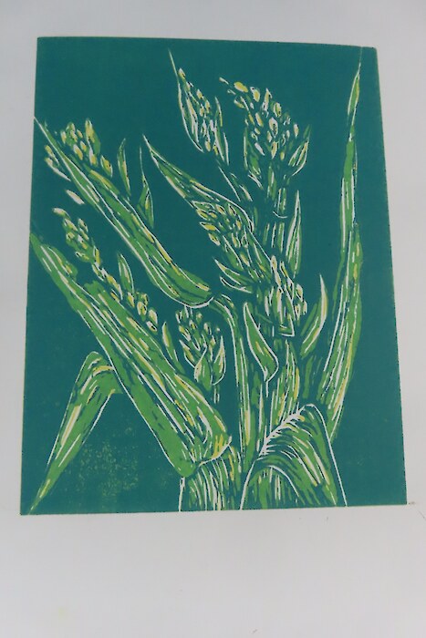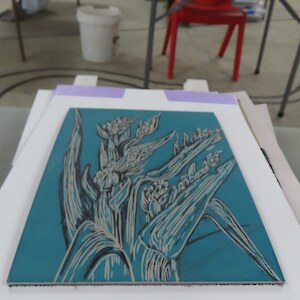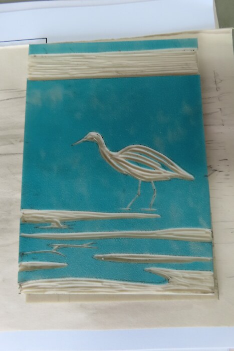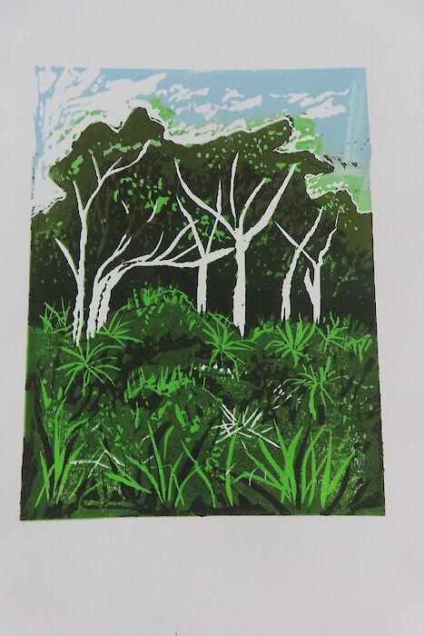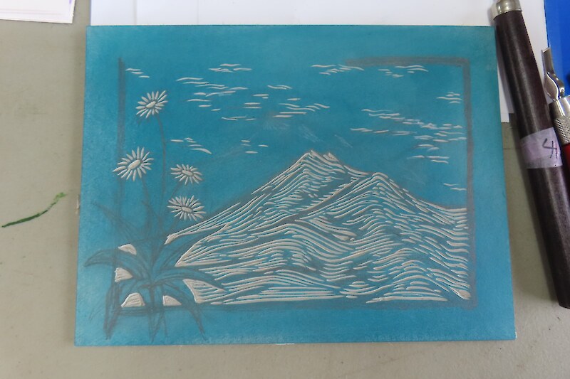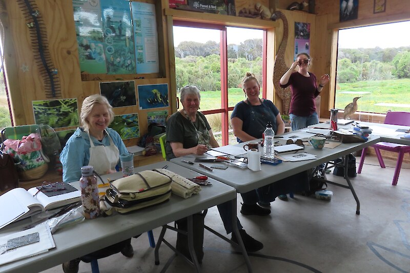 Always eagerly awaited, the workshop’s participants came into the room armed with pencils, paints, paper and enthusiasm. Chris gave a quick introduction to the “place” and a bit of Community Nursery background to newcomers and then Jo was straight into it. The room had been set up the day before with everything needed for “Lino Printing” including the small Nursery Press and a new Press Jo had brought down as well as various cutting tools, paper, paints and other materials. We were also lucky to have some taxidermy native birds from DOC to study very close up. The Rances wetland provided inspiration to some who used the landscape views and plants as themes.