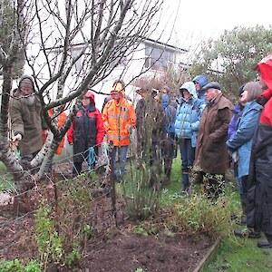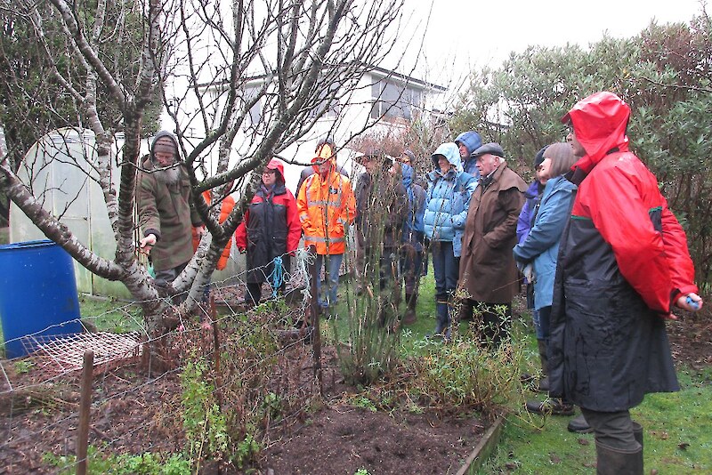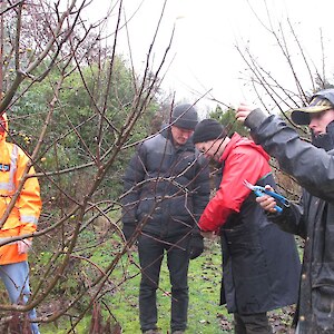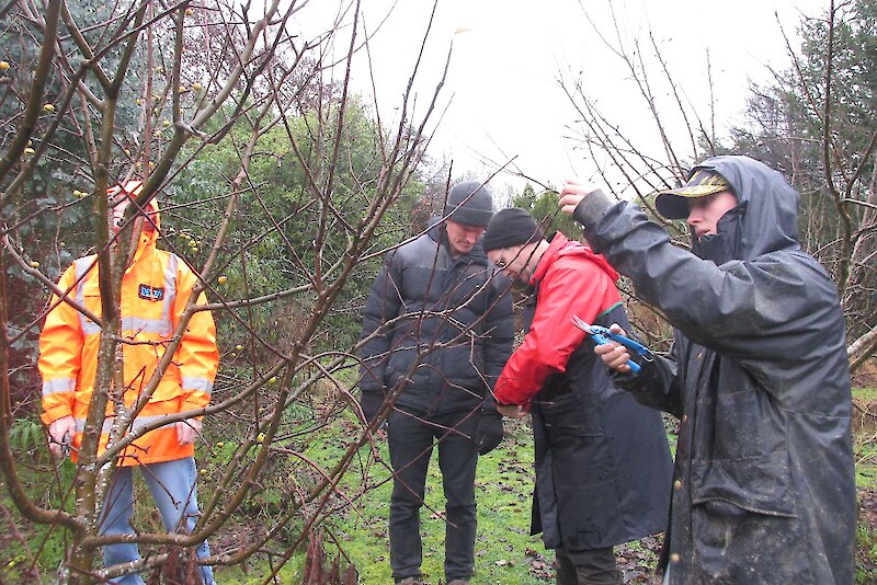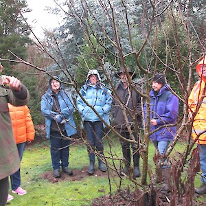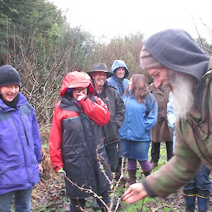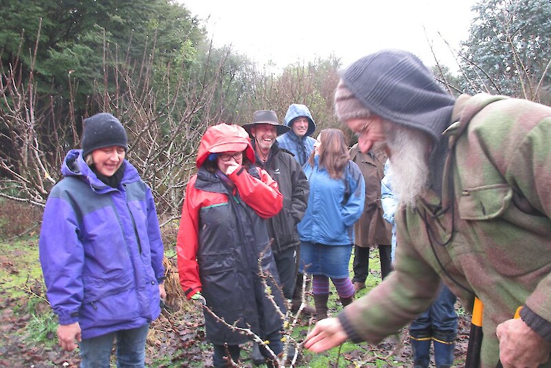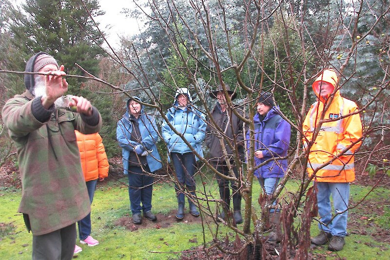 A group of 14 people attended the Pruning workshop on the afternoon of Sunday 2 July 2017. Like last year the weather was atrocious and Robert Guyton did a great job explaining the pruning process from the relative comfort of the Education Centre. A slide show explaining the open orchard project and the grafting process was shown to participants. Then we all went out and had the chance to examine and then prune some of Rances apple trees. Lots of questions showed the interest people had in learning the techniques, recognising fruiting spurs, and learning about scions and rootstock, and pruning for fruit, size and shape. It was an excellent afternoon – thanks Robert.