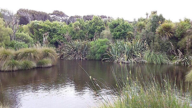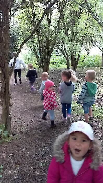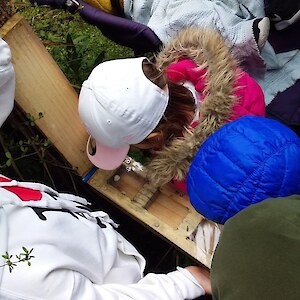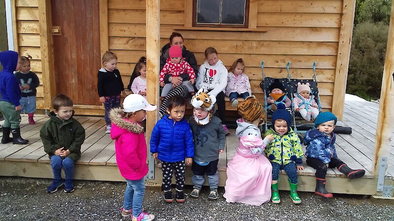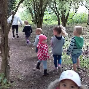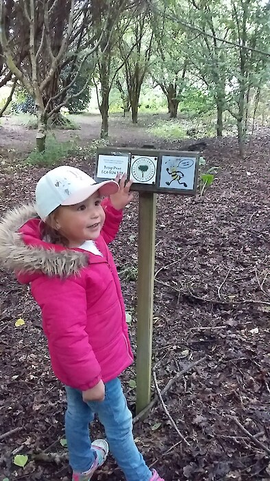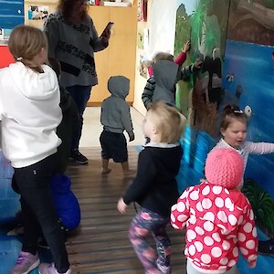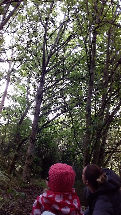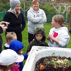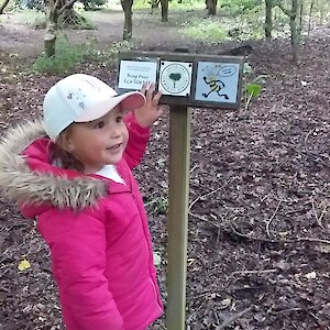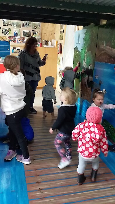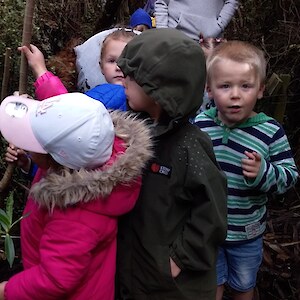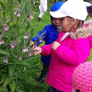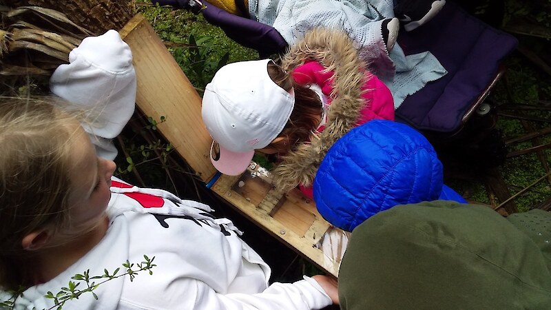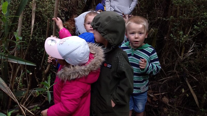 We wandered through the orchard smelling and feeling the herbs and flowers, and watching the bumble bees. Following the signs we stopped and spotted the two kereru sitting high in the trees, the strawberries were seen and squiggly worms held. The pond track was followed and we used our sense of touch to feel the roughness of the cabbage tree bark and smoothness of the hebe trunk. Weta and slaters were looked at up close in the bug hotels, we had a break at the hut, listened to the birds and some of us spotted scaup ducklings on the pond before they hid away. Exploring the panel pictures, listening to a story about Kiri the Kereru who ate too much, and playing with the soft toy birds finished a busy morning.