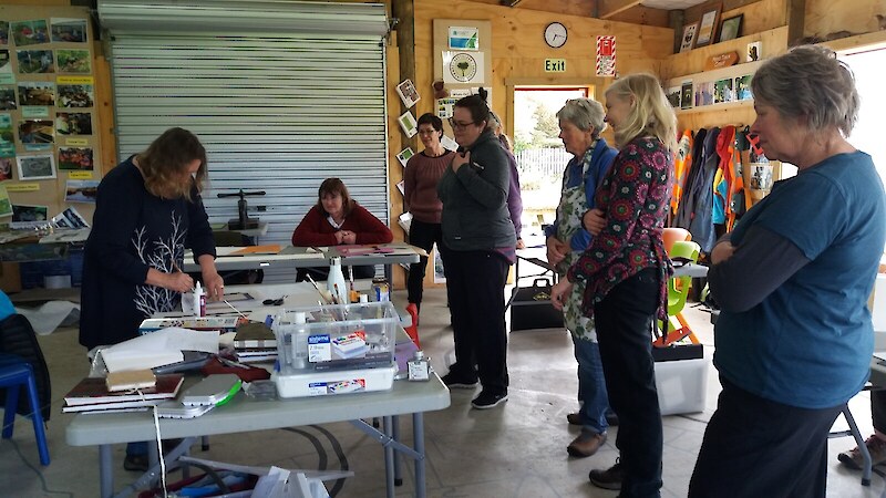 I came, I watched, I tried and tried some more! Jo brought samples of the beautiful Nature Journals she has created and filled with records of her travels. Filled with sketches that bring to life particular birds and places better than any bought keepsake, she inspired our group to begin our own personal notebooks. Printmaking, experimenting with inks, collage, ripping beautiful papers, textiles, cords and threads and generally getting to try out a variety of methods, tools and equipment meant everyone came up with a unique result – some possibly never to be repeated! But all surpassed our expectations.