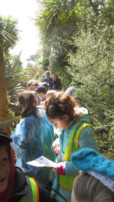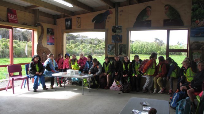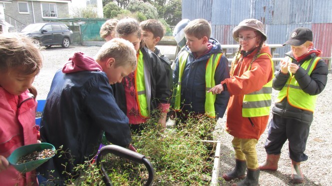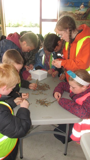 Twenty-seven children and parent helpers accompanied teacher Stacey Anderson to the Education Centre. They were very specific in their requirements – learning all they could about the native kowhai. Limehills School have a special relationship with a QEII Covenant “Kowhai Reach” at Kuana near their school. The covenant, one of the first in Southland, was initiated by a group of farmers wanting to protect in perpetuity, a meandering section of the Winton Stream containing many mature kowhai trees. The children had brought along kowhai seeds collected from that site and Chris explained, and then demonstrated how to clean, prepare and sow the seeds. Before that the children showed their knowledge about the kowhai tree – how many species of kowhai are there in New Zealand? How many species live naturally in Southland? Where do kowhai like to live? What does the kowhai tree look like (flowers, leaves, bark)? What birds like kowhai and why? Why might kereru like eating the leaves? What did Maori people use the kowhai for? The students showed an excellent knowledge of kowhai trees by answering many of these questions. Then the group was split into two with Chris leading a plant trip around the ponds while Bronwyn lead a kowhai potting up session. Other activities included measuring kowhai leaves from Sophora microphylla (small leaved), the only kowhai species naturally found in Southland and the day ended with lunch in the education centre followed by a race around the koru maze in the paddock. It was a very busy and successful visit.