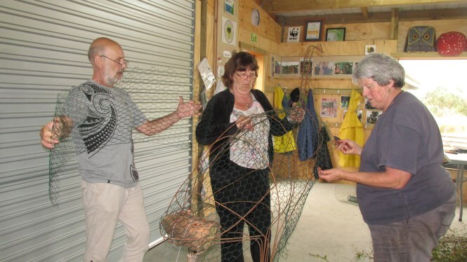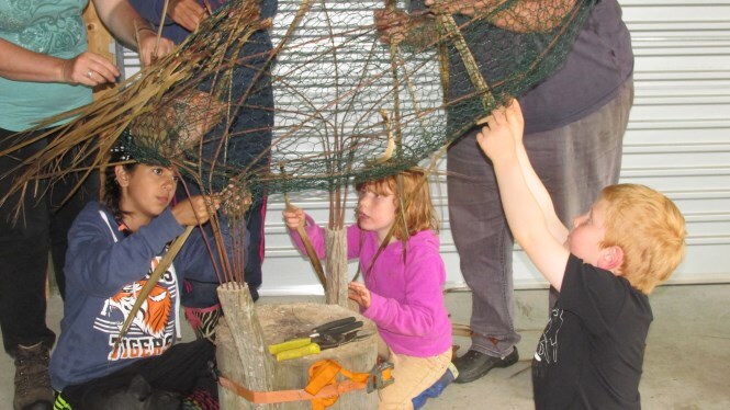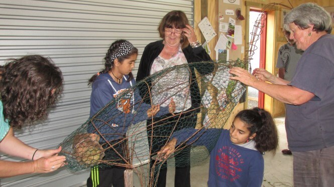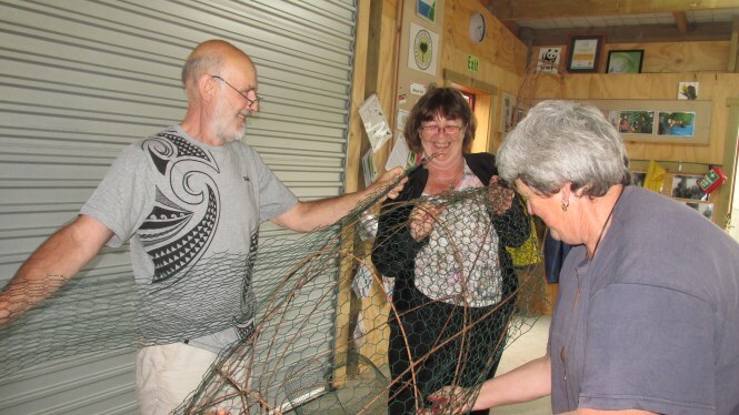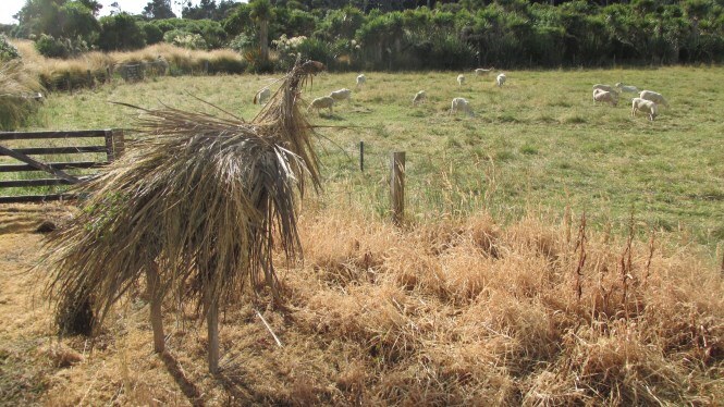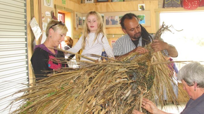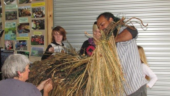 The frame was made by Ray Jackson with typical kiwi ingenuity using number 8 wire and then a whole group of people, including visitors from the north east of England set about “clothing” the frame with cabbage tree leaves, native vines and native grasses.