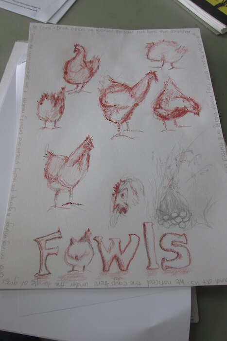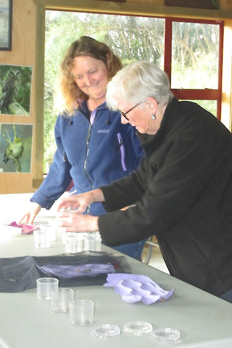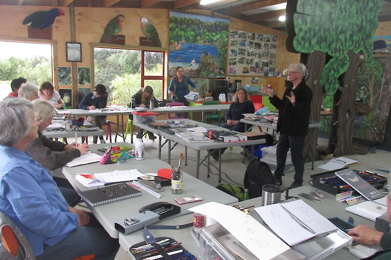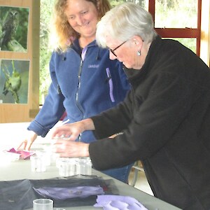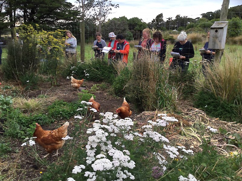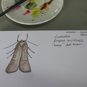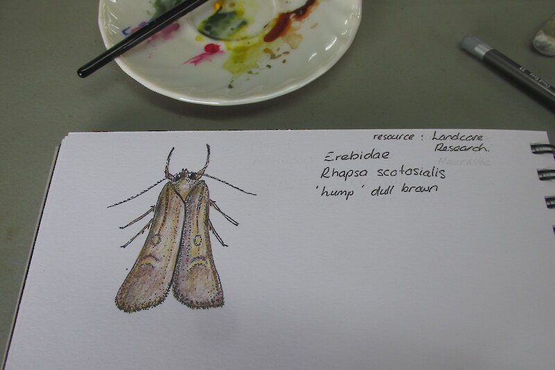 Being held at the Rances property in Otatara allowed the 12 students from Southland to closely observe and record their own perspectives of protected ancient forest, wetland, a large native restoration/ revegetation project and a diverse domestic garden. All are within easy reach of the purpose-built Southland focussed Education Centre. Moth traps (set up overnight), taxidermy creatures, books, magnifying glasses, white-boards, wonderful paintings, great coffee – all are at your fingertips. Jo and Sandra’s willingness to share their own extensive resources and their inspiration and passion.