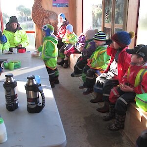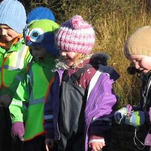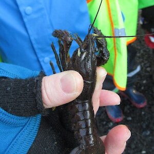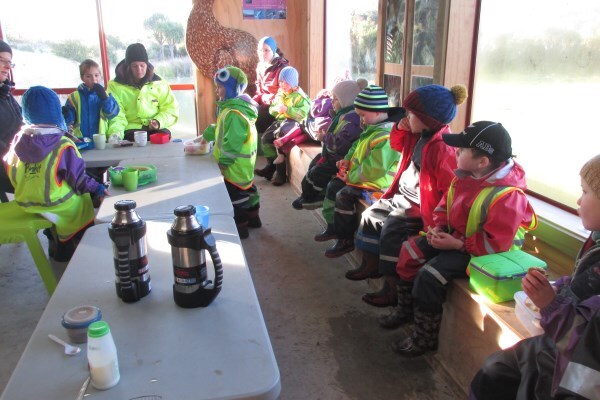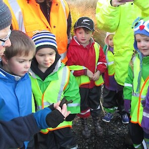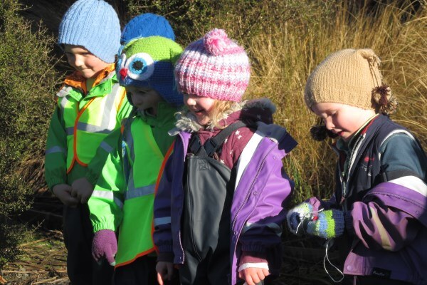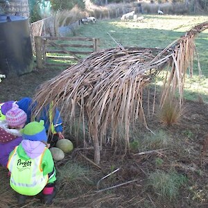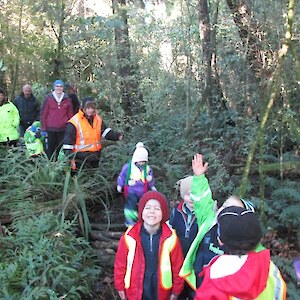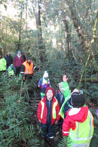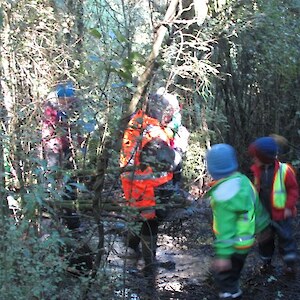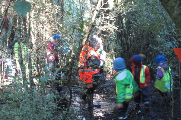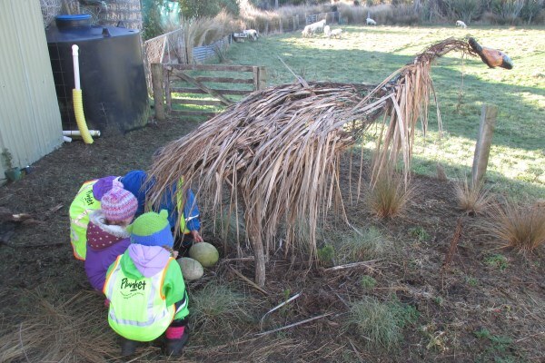 Wednesday 5 July 2017 - Otatara Kindergarten. A fine but cold wintry morning saw 10 nature discovery children arrive ready to explore the Southland Community Nursery environs. We followed the signs through the orchard and past the vege gardens to the education centre where the children were wondrously engaged in the tunnel, opening the doors to see what was there! We had a meeting (just like they do every week at nature discovery) talking about keeping ourselves safe then it was off around the pond. We pulled up the nets from the pond to find a koura (freshwater cray) and some water insects which we looked at in detail. Along the track we looked at different leaves, talked about how special our native plants are, and spotted the piwakawaka (fantail) flitting around us. After some kai it was back out exploring around the bush track hugging 400 yr old kahikatea, listening for birds and sludging through the swamp forest. Back at the pond the ducks has arrived so we gave them a feed before finishing up and heading home. A wonderful morning and we all had fun with a delightful group of children, thanks Kim.