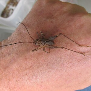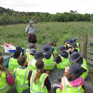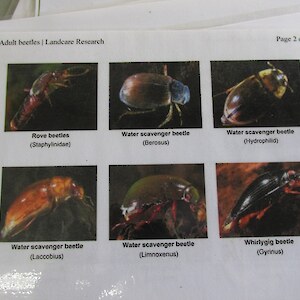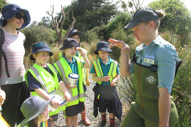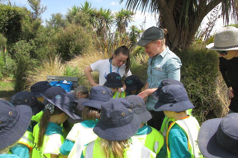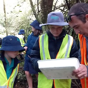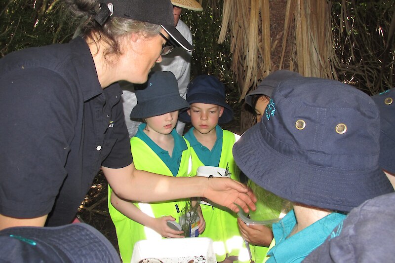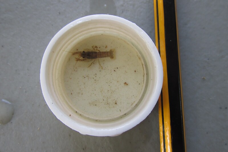 At the pond, blue damselflies were flying and landing on the pondside rushes. Their freshwater stage larvae were also observed under the water, wirlygig beetles were found zooming around but the most exciting find of the day were two very tiny koura babies – see photo with a pencil for scale.