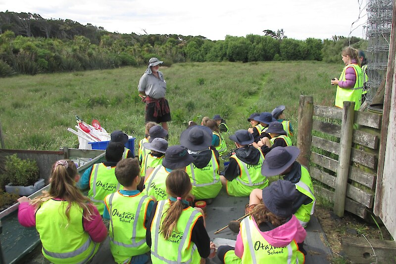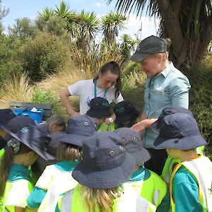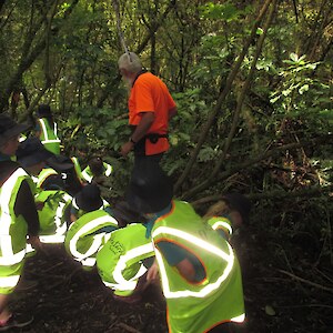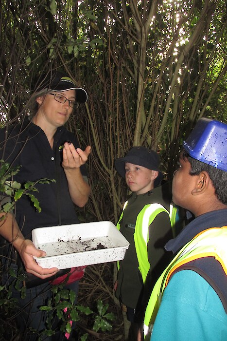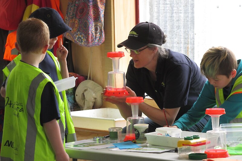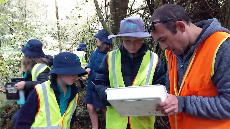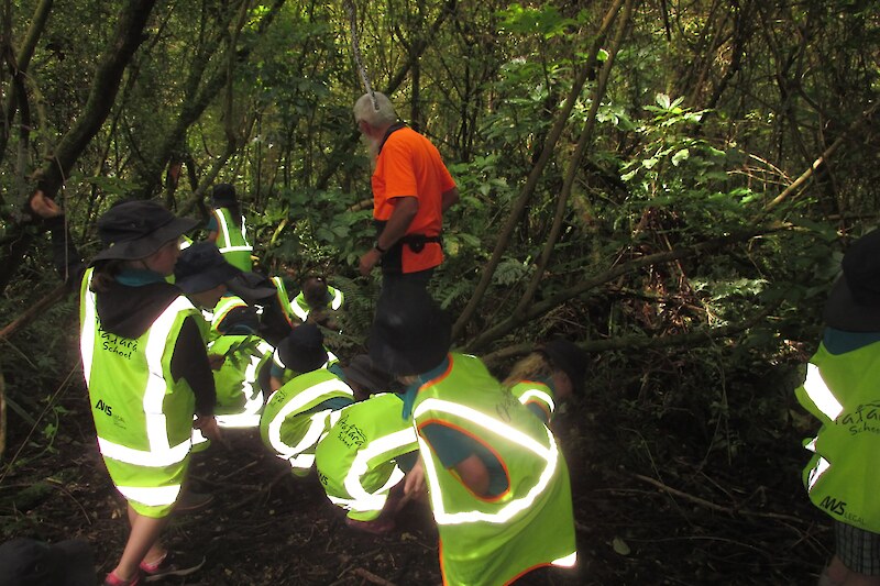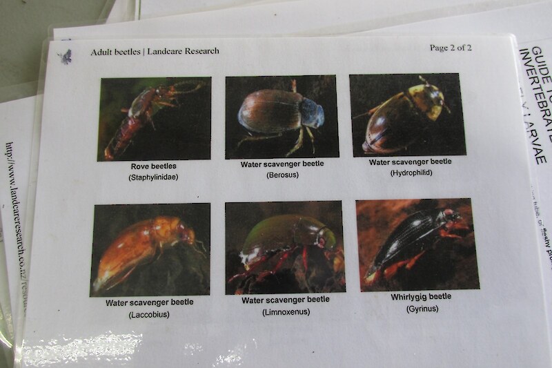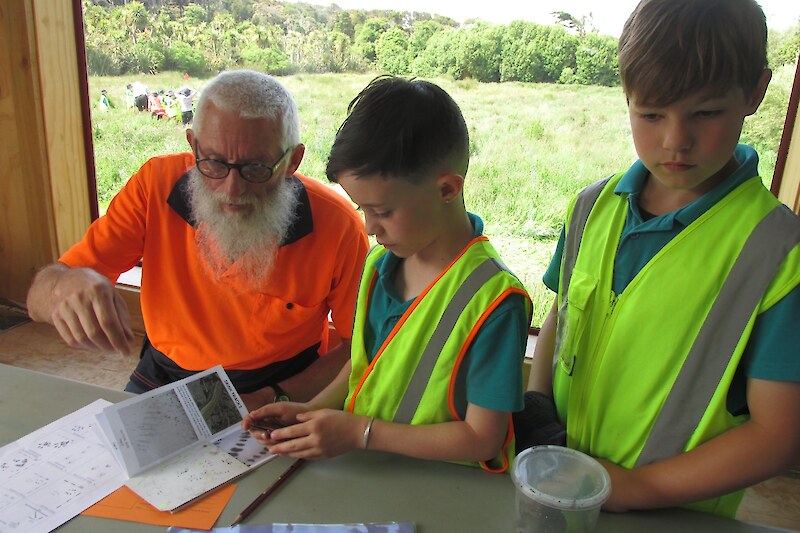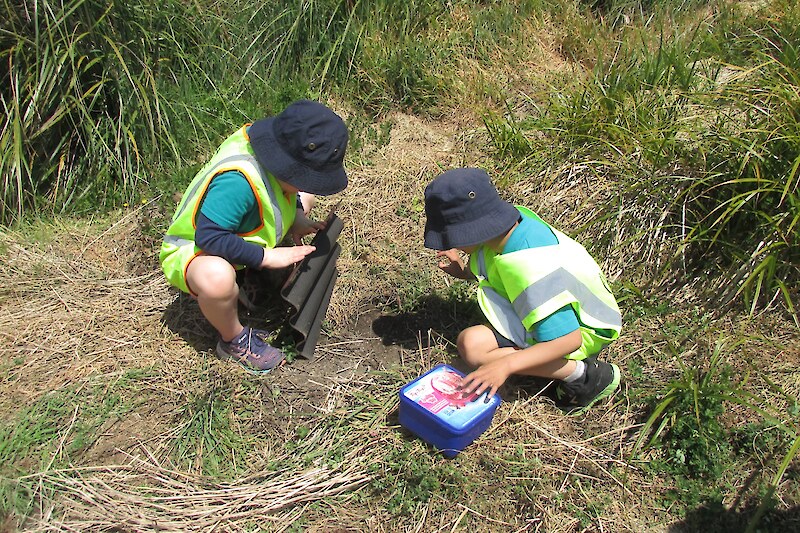 Bush – we learned all about “Loopy Nachos” from Mark Oster (a tale about Looper and Notcher caterpillars on flax leaves). Lots more ferns and shade loving plants were collected and identified and Kotukutuku Fuchsia flowers looked at closely under magnifying glasses. Ground beetles and spiders were collected. There were some chew marks on the possum chew cards but rumour has it that they belonged to Mark Oster!!