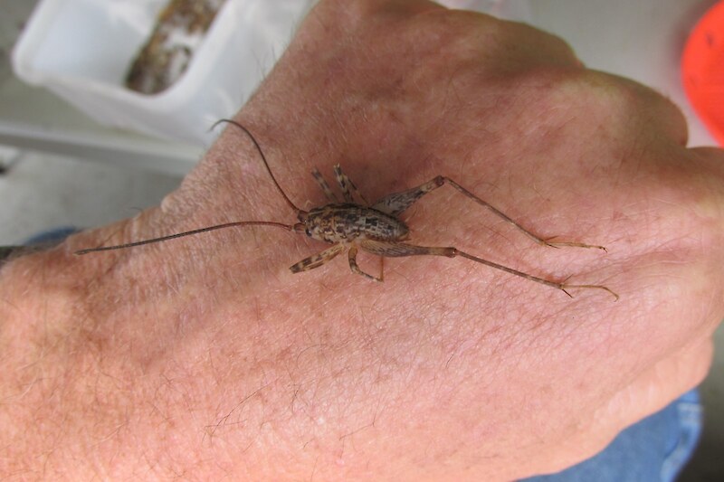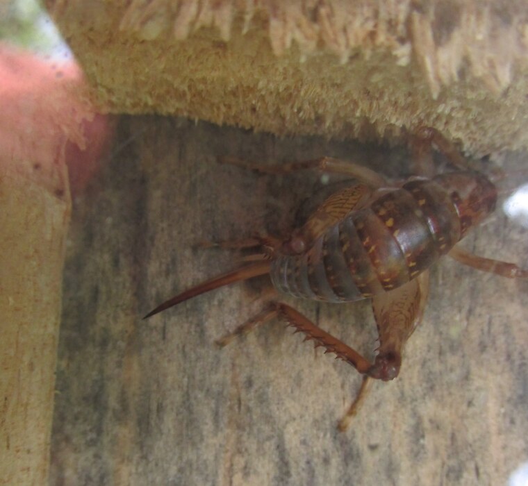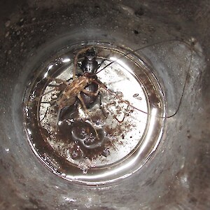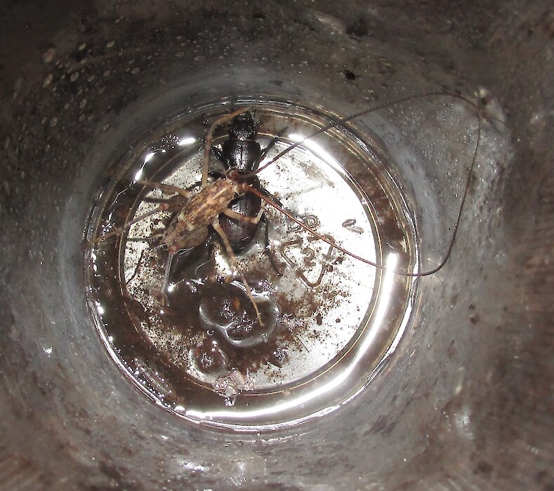 Restoration Area – the pitfall traps were emptied with a large black ground beetle and a weta in one, the weta hotels around the restoration area also had weta inside them, the Artificial Cover Devices (ACD’s) – brown corrugated covers were lifted up carefully but not much was found underneath this time. On Monday a skink lizard had been seen (fleetingly!).