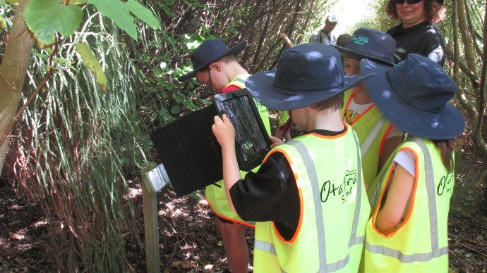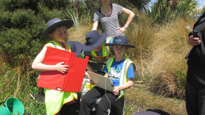 An action packed day for 27 Otatara School children was held at the Southland Community Nursery on 10th December 2015. A session of “work” helping out in the Community Nursery – potting cabbage trees and track clearing was followed by five separate nature activities. From drawing or modelling bugs, identifying native birds, sketching the landscape, doing a factfile on native plants on their iPads, to studying and recording insects found in the bush. It was full-on, with groups of 5-6 children, accompanied by a parent, moving on between activities every 20 minutes. After lunch and a run around the grassy koru, everyone headed for the “supersleuth” activity trail around Bushy Point. The weather was hot and windy and a contentedly tired group (the parents anyway!) departed by bus around 2pm.