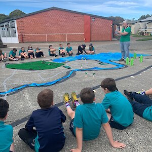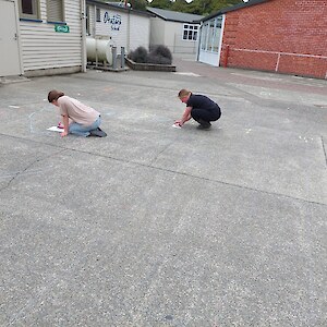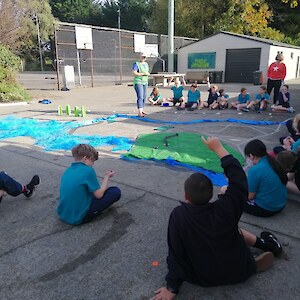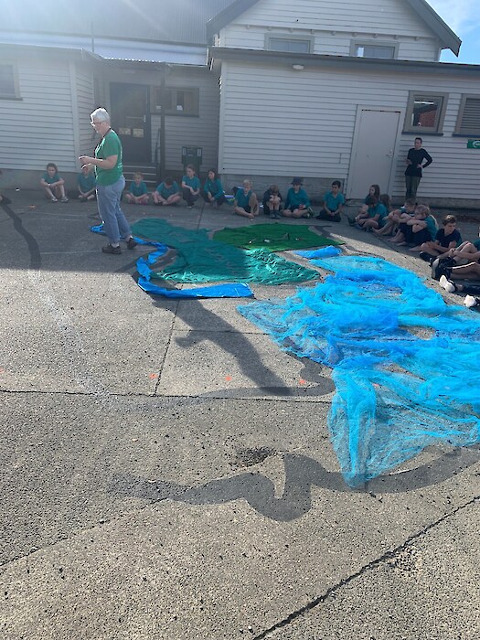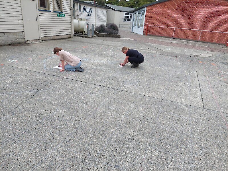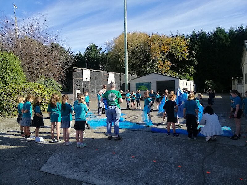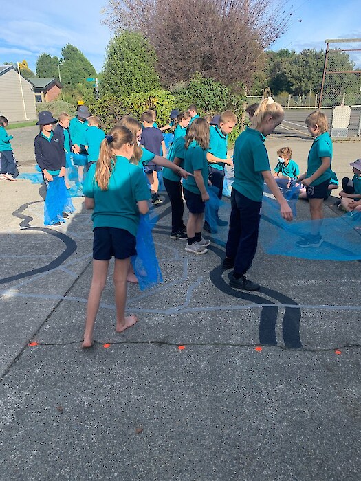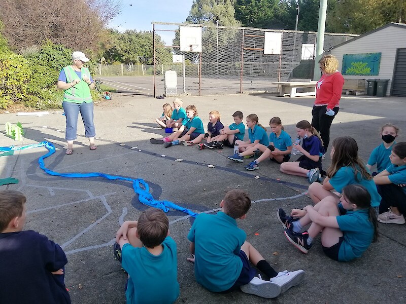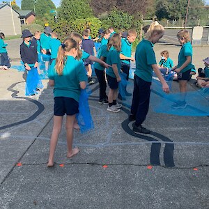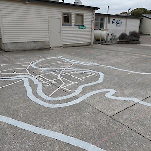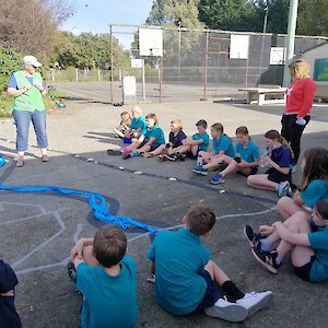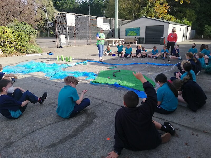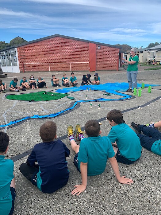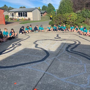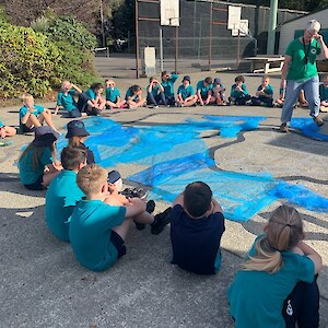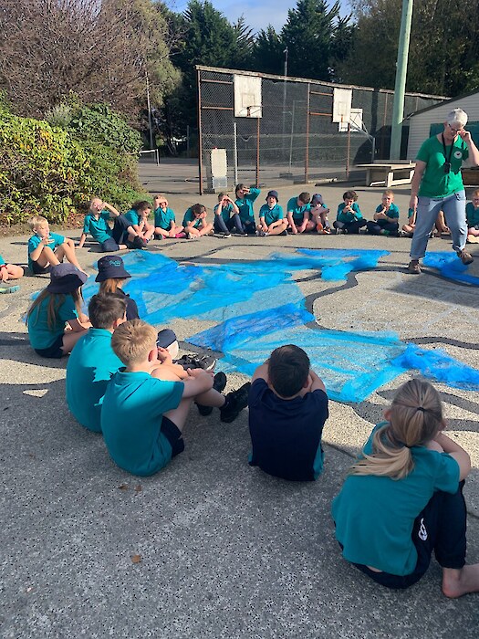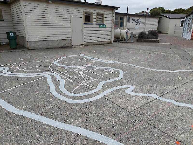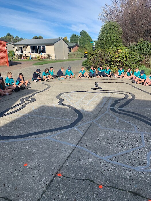 Having been inspired by the giant map at the Southland Community Nursery, staff at Otatara School decided to paint their own on the school grounds. Contributing my ‘know how’ from the time the first version of the map was created, we painted and rolled ready for the start of term 2. I was then invited to join in with the senior classes of Otatara School (Mānuka, Akapuka, Tī kōuka, Pōkākā and Tarata) to work out what the graffiti like squiggly lines on the concrete represented and the stories that can be told about our local places.