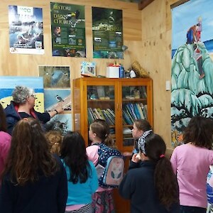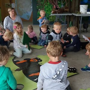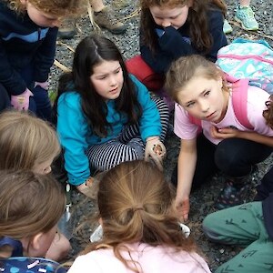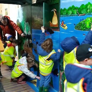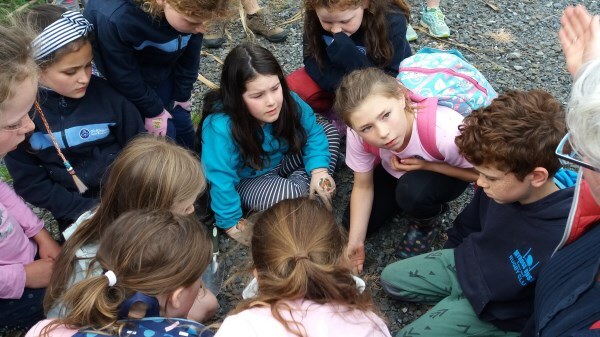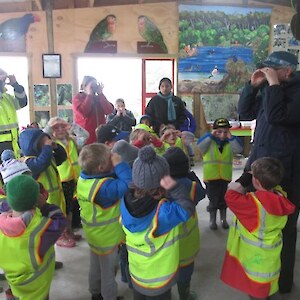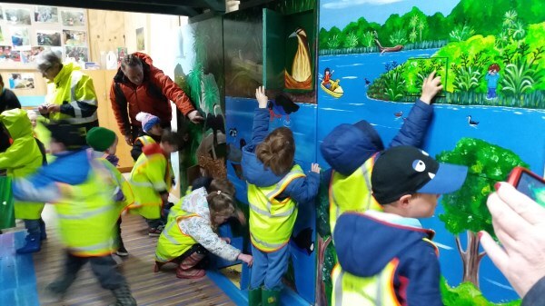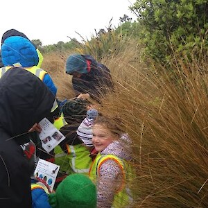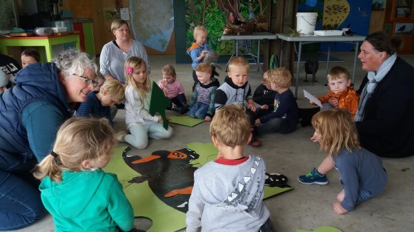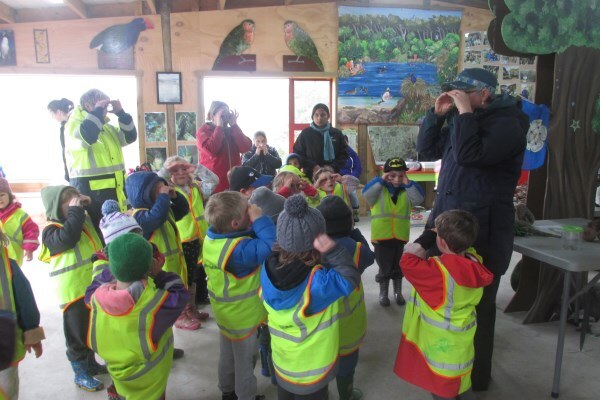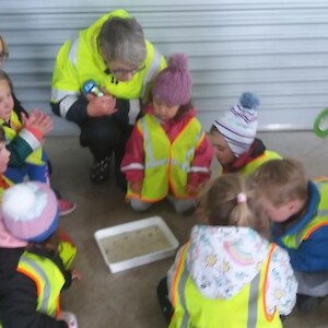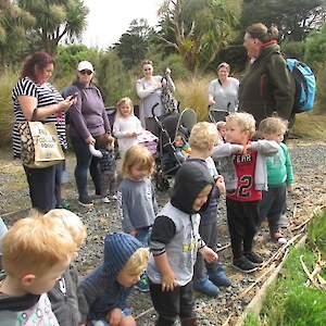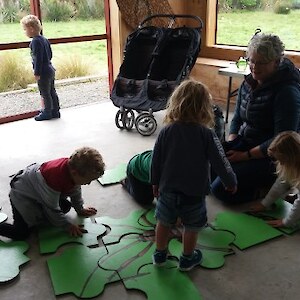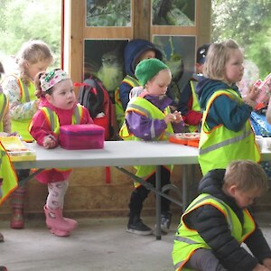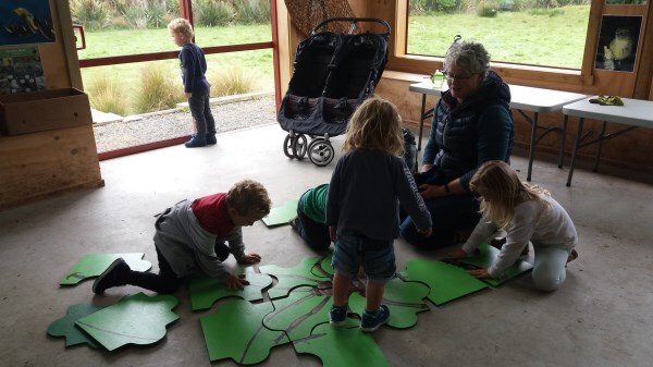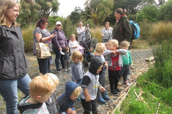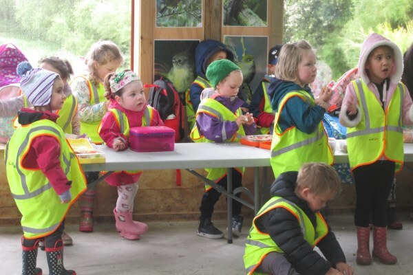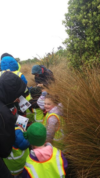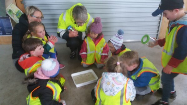 “We’ll be coming rain or shine” said Wendy McLachlan head teacher of Lindisfarne Kindergarten. So we knew they would be well prepared for the Southland weather on Tuesday – and it was indeed cold, wet and wild! But after walking through the orchard, exploring the Nature Centre and having morning tea we all headed out to do a scavenger hunt around the pond using our senses – eyes, touch, hearing and smell. We were also lucky that at the pond there were some interesting critters caught in the nets – dragonfly larvae, backswimmers, beetles and koura to name a few. We took the pond creatures back to the Nature Centre for a closer look and did some of the big floor jigsaws as well as more exploring in the wetland tunnel and a kiwi song with actions. The group closed by singing a lovely Waiata to Bronwyn and Chris.