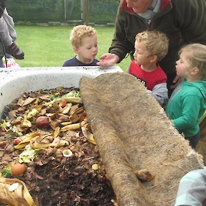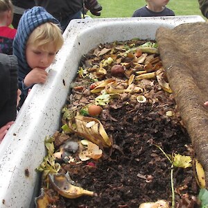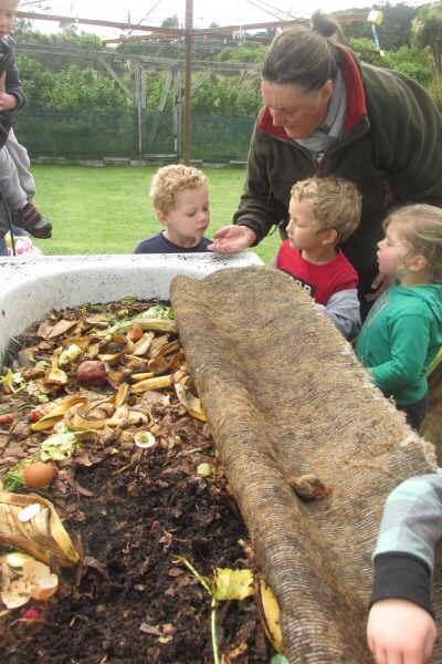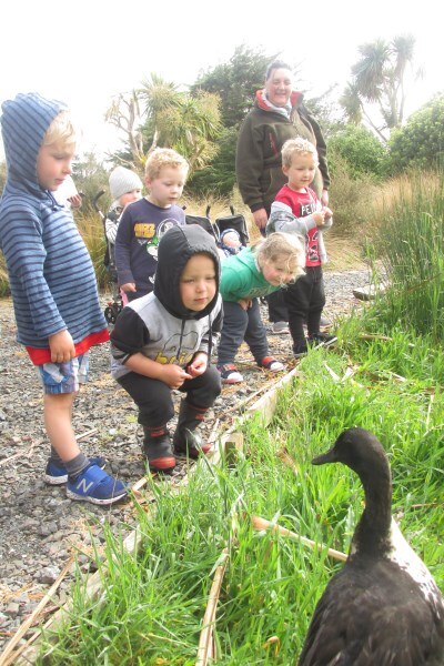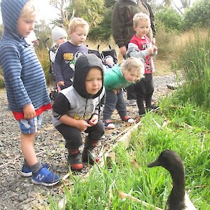 Robyn Gamble brought a group of Busy Bodies to the nursery on Thursday 22 November and I am pleased to say the weather had much improved. We had a leisurely walk through the orchard and veggie gardens and then explored the worm farm made out of an old bath. The children marvelled at these little recyclers chomping their way through the veggie scraps, and had fun gently holding them. After putting them back into the dark we went straight down to the pond area – Donna the resident duck was there, and we looked at the pondlife that had been caught in the trap. The smell from the cabbage tree flowers was very strong and tui’s were taking nectar from the flax flowers. In the Nature Centre the children enjoyed the wetland tunnel and learning about insects by doing the big butterfly and weta jigsaws