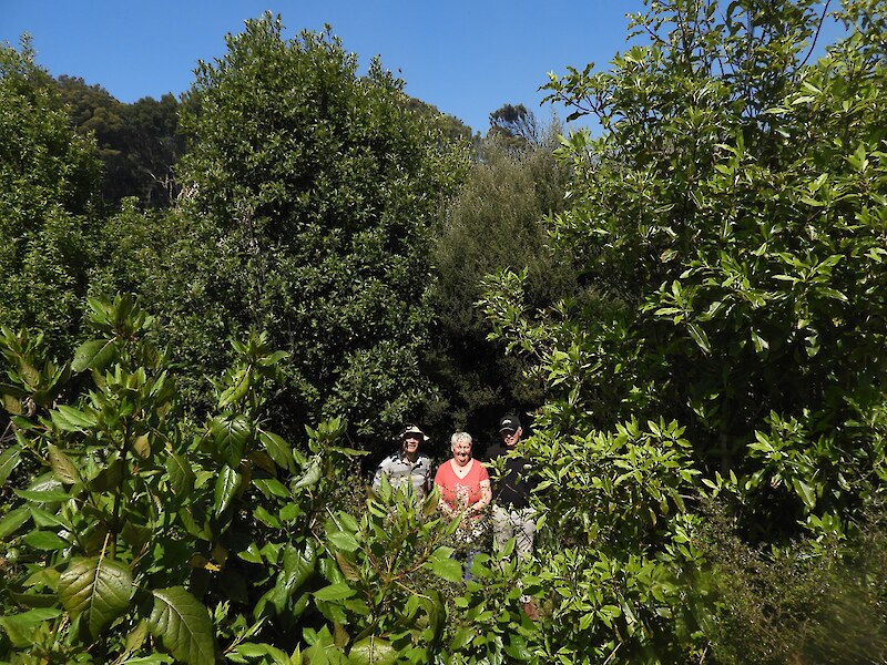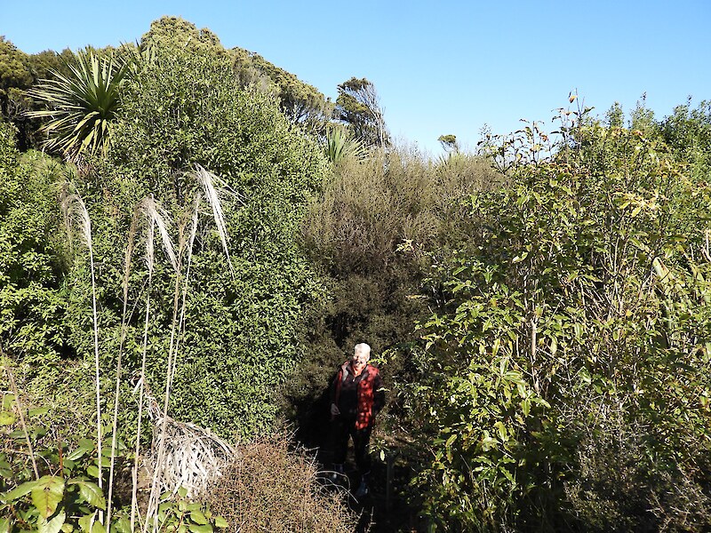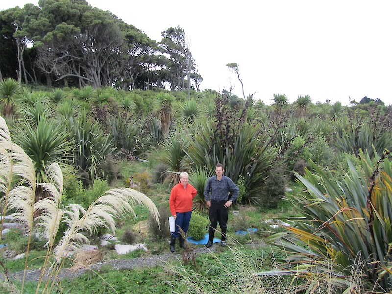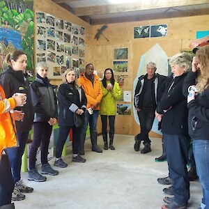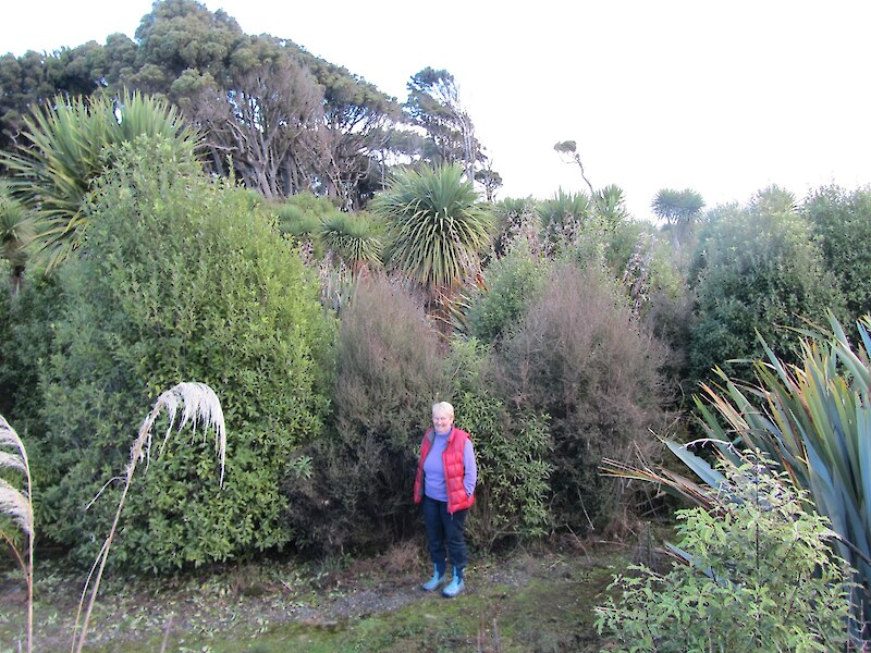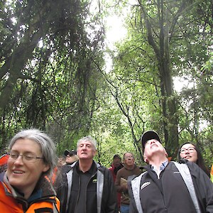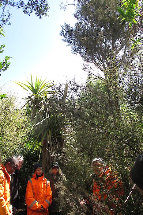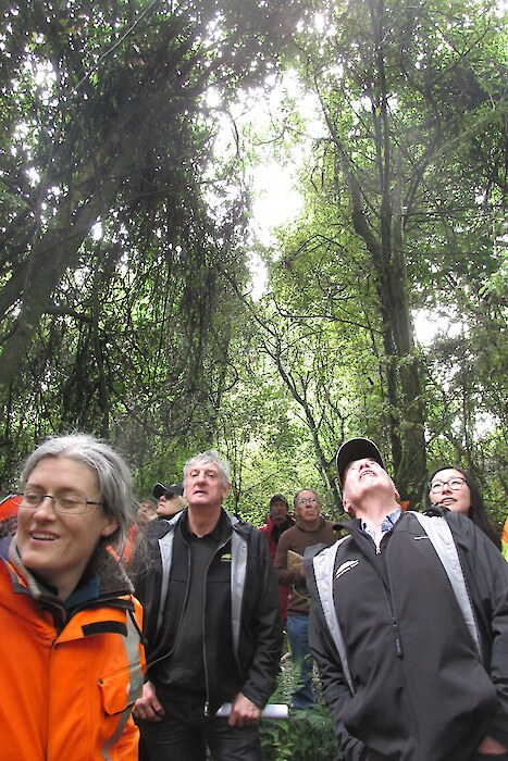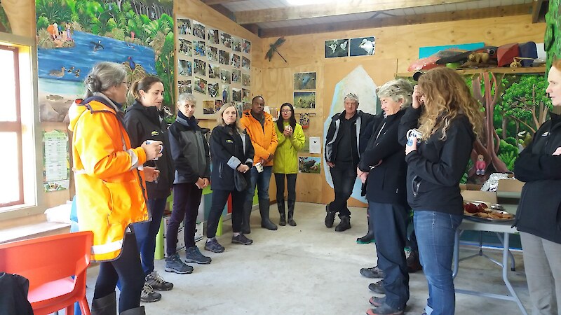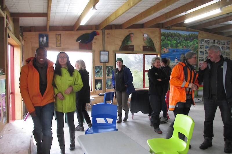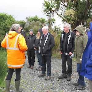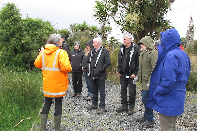 Southland QEII Rep Jesse Bythell brought the QEII Board and staff from Wellington for a Covenant visit on a very cold blustery day. The visit was part of their three day meeting and the Board travels around the regions for its meetings and covenant visits. It was the second visit in so many weeks by some of the Board and staff as they had also attended the Southland Covenantors gathering here in early November. Other invited guests were Randall from ES, Christine and Tapuwa from SIT, Dallas from Pestbusters and Sheryll from ICC. How different the weather was for their two visits – scorching sun on the first, hail on the second!! It didn’t dampen enthusiasm however and after lunch in the Education Centre, and informal chats, the group accompanied Jesse and Chris around the covenant tracks including the track funded by QEII’s Stephenson Fund. A Hut inspection followed and a poke into the tall forest. There were lots of good questions, discussions and learnings before the group headed off to Bowman Bush Reserve also in Otatara.