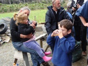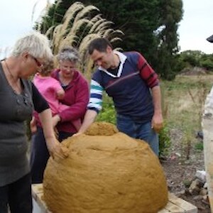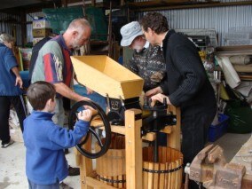 Community Nursery events dont always feature native plants! Two recent events attended by Nursery regulars were a Cob Oven building workshop at Russell and Bronwyn Grahams in Otatara, run by Peter Aalders from Riverton (see Peter’s feet below!) and a recent apple pressing event at the Community Nursery. Both events were interesting, informative, and very social!