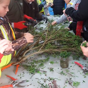 Chris’s group learnt first all about seeds as that is the best way to propagate or grow new native plants. Chris explained that seeds provided plants with diversity, as opposed to cuttings which are a clone or exact copy of the plant. Thinking about what equipment we might need to take cuttings and some good answers were: the plant, secateurs, pots, some said soil (but we actually use river gravel), rooting hormone powder and labels. Chris had collected some hebe branches and everyone had a go at making some cuttings. The group learnt about the process – cutting a tip of the plant, measuring 12-15 cm and cutting below a leaf node and removing ¾ of the leaves, dipping in rooting hormone and putting in river gravel. After doing about 4 trays of 40 cuttings we went out to look at the currant bushes and learnt that the same technique can be used for those as well. The worm farm was looked at as a bonus!
