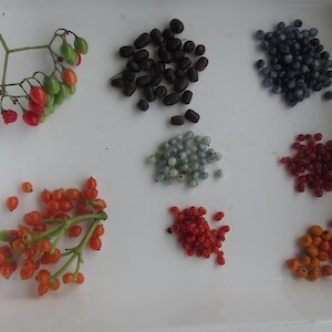 I often think seed collecting is a bit like searching for jewels! Once you get your eye in, there they are – beautiful, sparkling, translucent orbs of colour. The photo below has some of the seeds I collected on Saturday 2 February 2019. Can you identify any of the species – and guess the odd one out? Its not native and its actually poisonous so you would be well advised to learn about it and certainly not eat it. The others are natives, mainly in the coffee family.