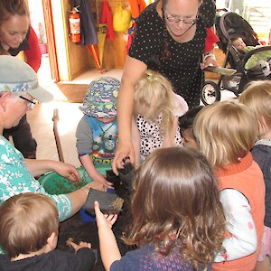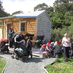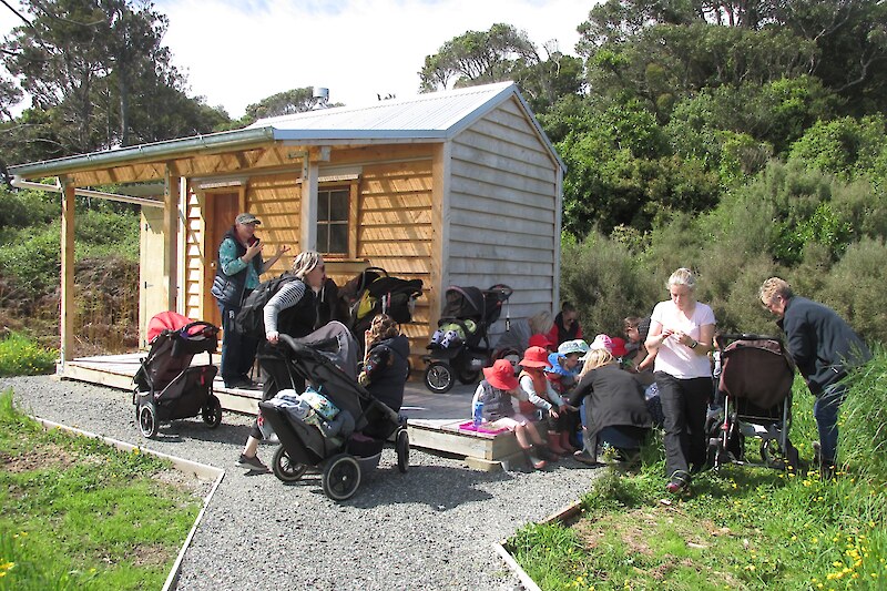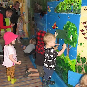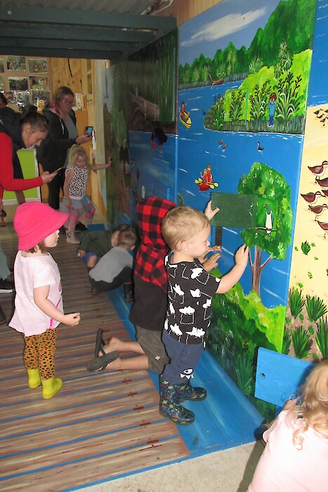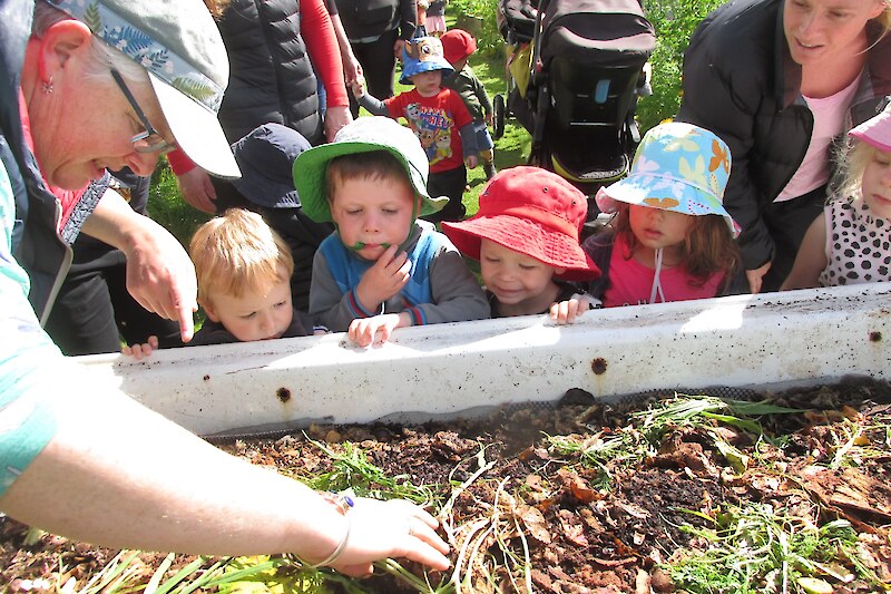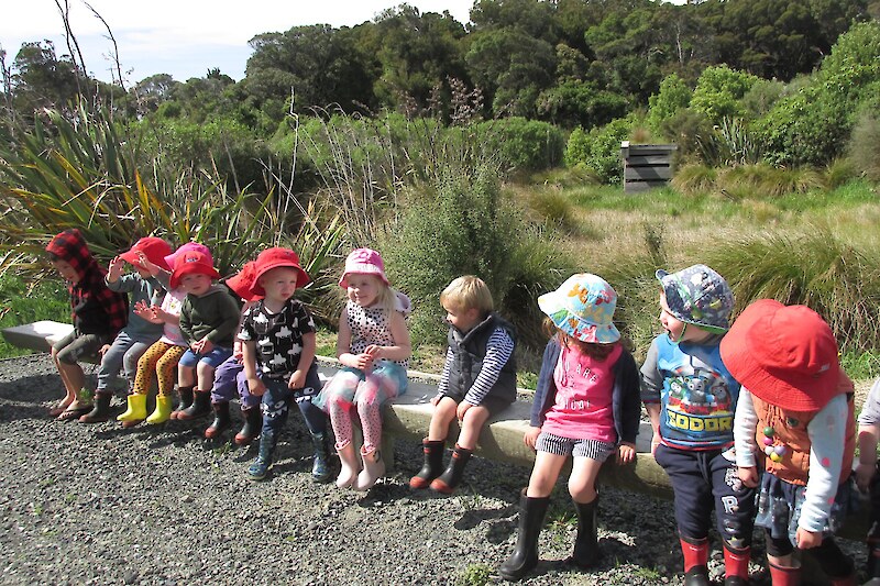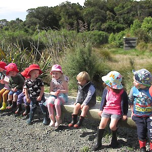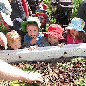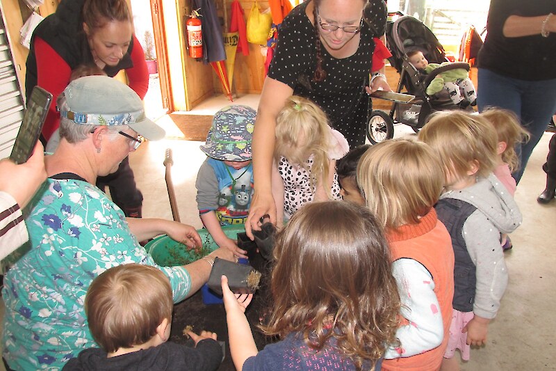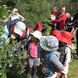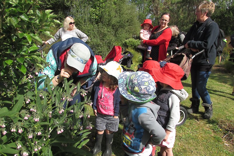A sunny day and along with a wonderful group of educators we connected with nature, smelling and touching the different leaves and flowers, looking at the baby apples growing on the apple trees, and checking out the pest traps – all before going on a walk around the pond. Kererū flew around us and landed in the nearby tree, giving us a great look at this majestic bird of the forest. After some morning tea at the hut, spotting an admiral butterfly and day flying magpie moth, we continued to use our senses to find all the objects listed on the sensory scavenger hunt list – try it at your place – See Activity Cards at: https://www.southlandcommunitynursery.org.nz/education-centre/activities/school-activities/. Back at the Education Centre the children explored the habitat panels and potted up some kōwhai seedlings, giving back to nature.