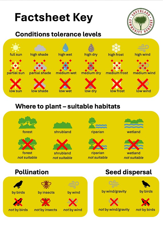 Plants that tolerate wet conditions and exposure to full sun and wind are necessary for wetland restoration. Using a small range of Southland species you will have most success. It is important to follow the stream profile diagram for the placement of plants closest to the water. The following is a list of Southland native plants that thrive in wet places and are the most suitable for Southland.
